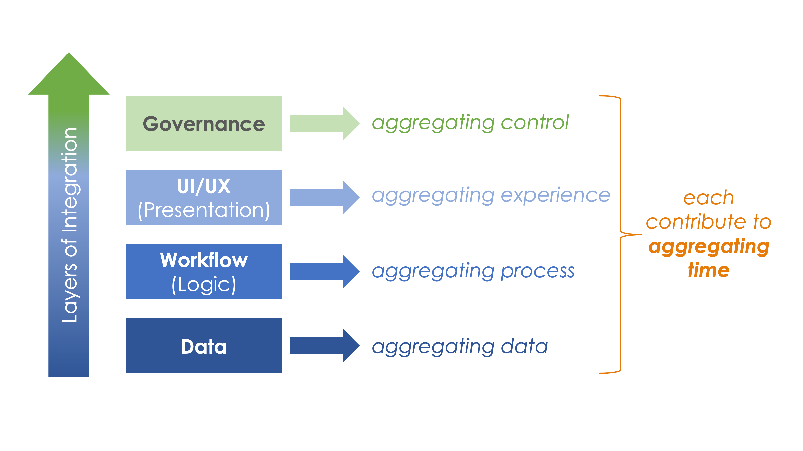 I’ve taken Hugh’s elegant concept of aggregating time and inelegantly split it across the different layers of integration to better illustrate the relationship between integration and aggregation. Aggregating data, workflow, UI/UX, and governance all play a role in aggregating time. But their contributions are distinct enough that, especially in a virtual platform stack, different products are able to be the authoritative service for that slice of aggregation.
