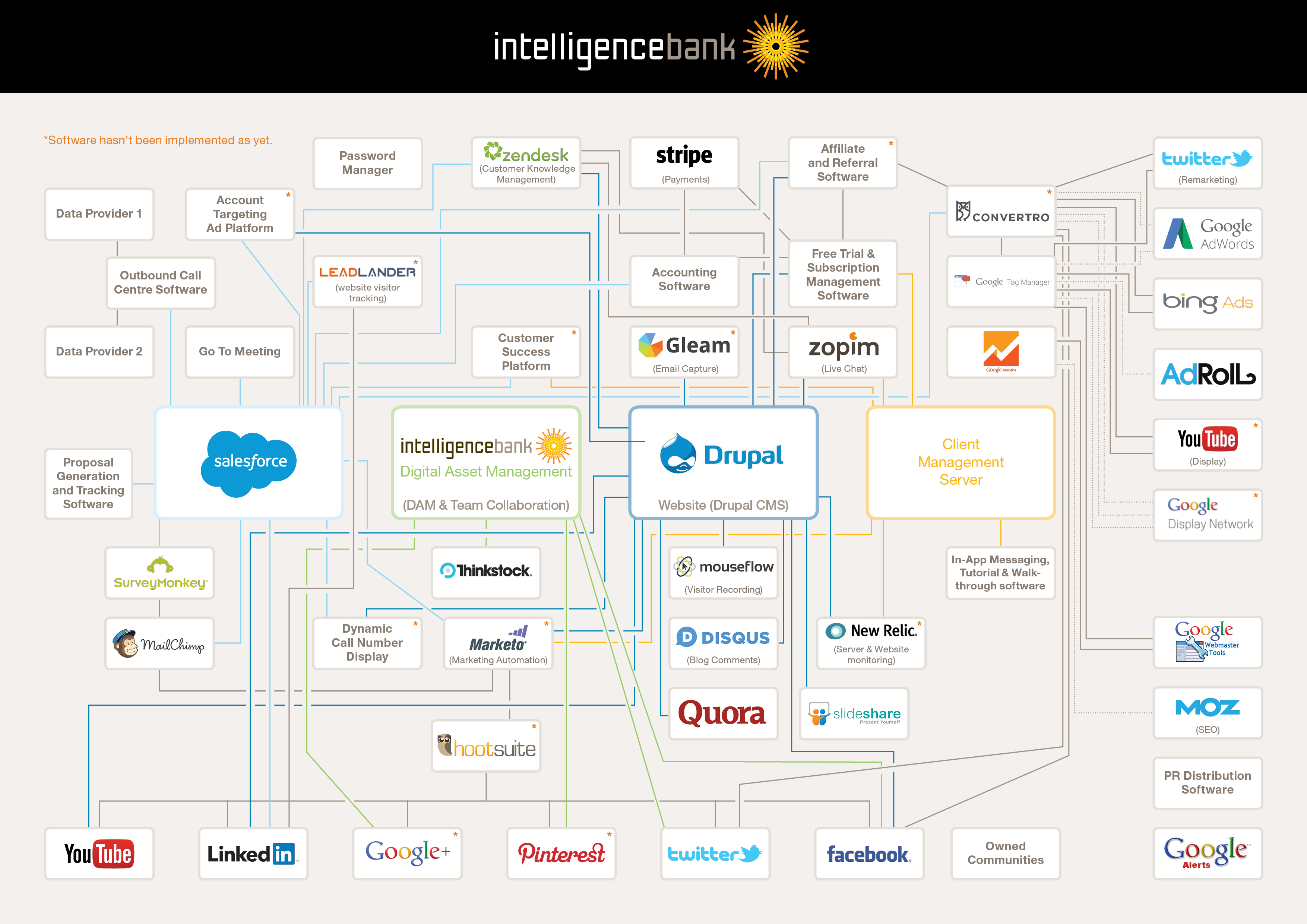 It’s fascinating to see which components have the most “wires” connected to them, such as Salesforce (CRM) and Drupal (CMS). You get a sense of which components are effectively platforms based on their degree of interconnectivity. The fact that there’s not simply one platform at the heart of this is evidence of these maturing multi-platform architectures that I wrote about last month. Here, we have a CRM, a MAP, a CMS, a DAM, an SRP, and a TMS all working together.