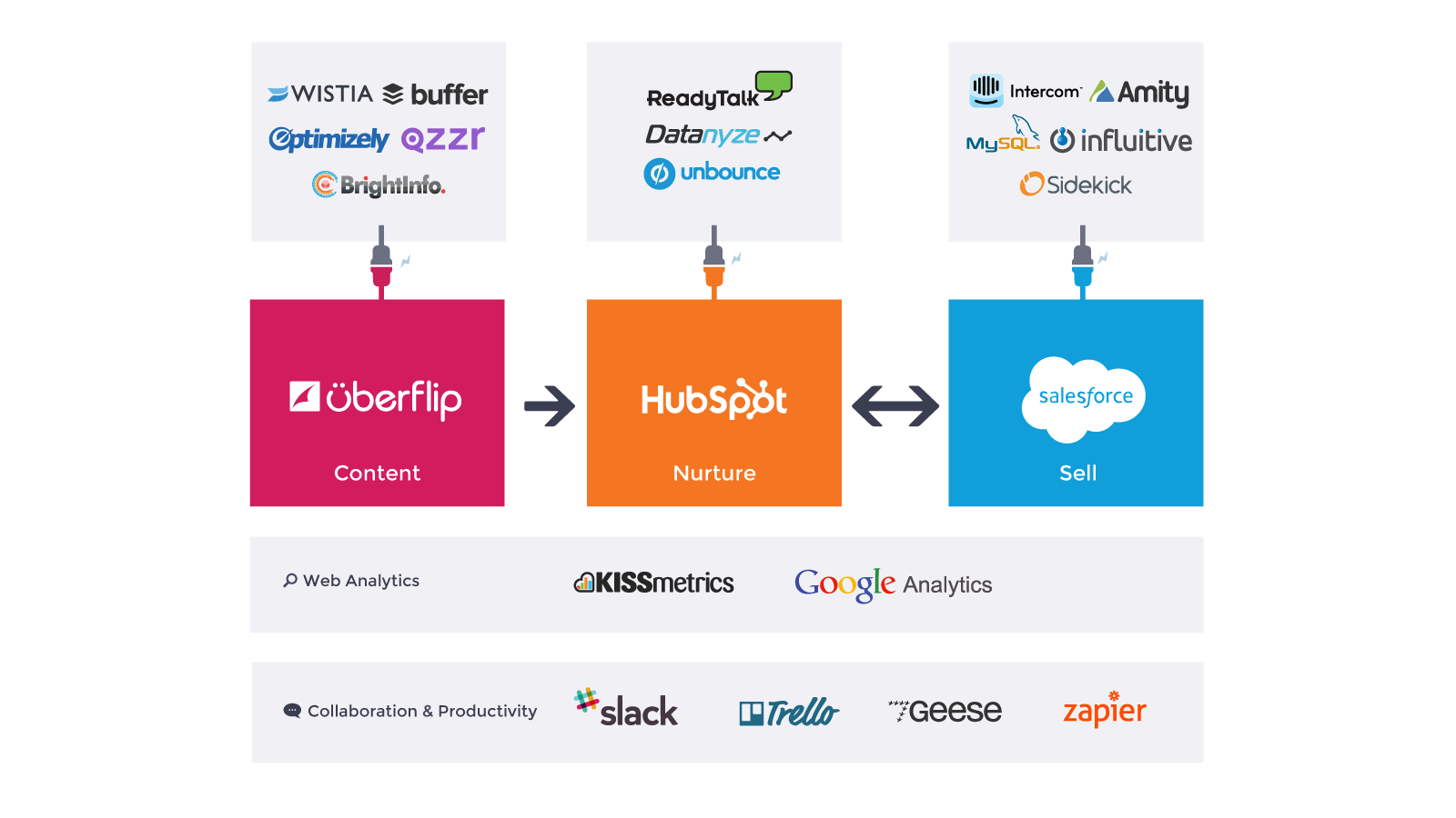 I love the clean and simple design of this stack. It is structured around three “stages” of capabilities — content, nurture, and sell — that also gives it the feel of a multi-platform architecture. Each of these stages has a primary component — Uberflip, HubSpot, and Salesforce, respectively — with other products designated as plugging in on top of them. A layer of analytics sits below all three stages, as does a set of collaboration and productivity tools.