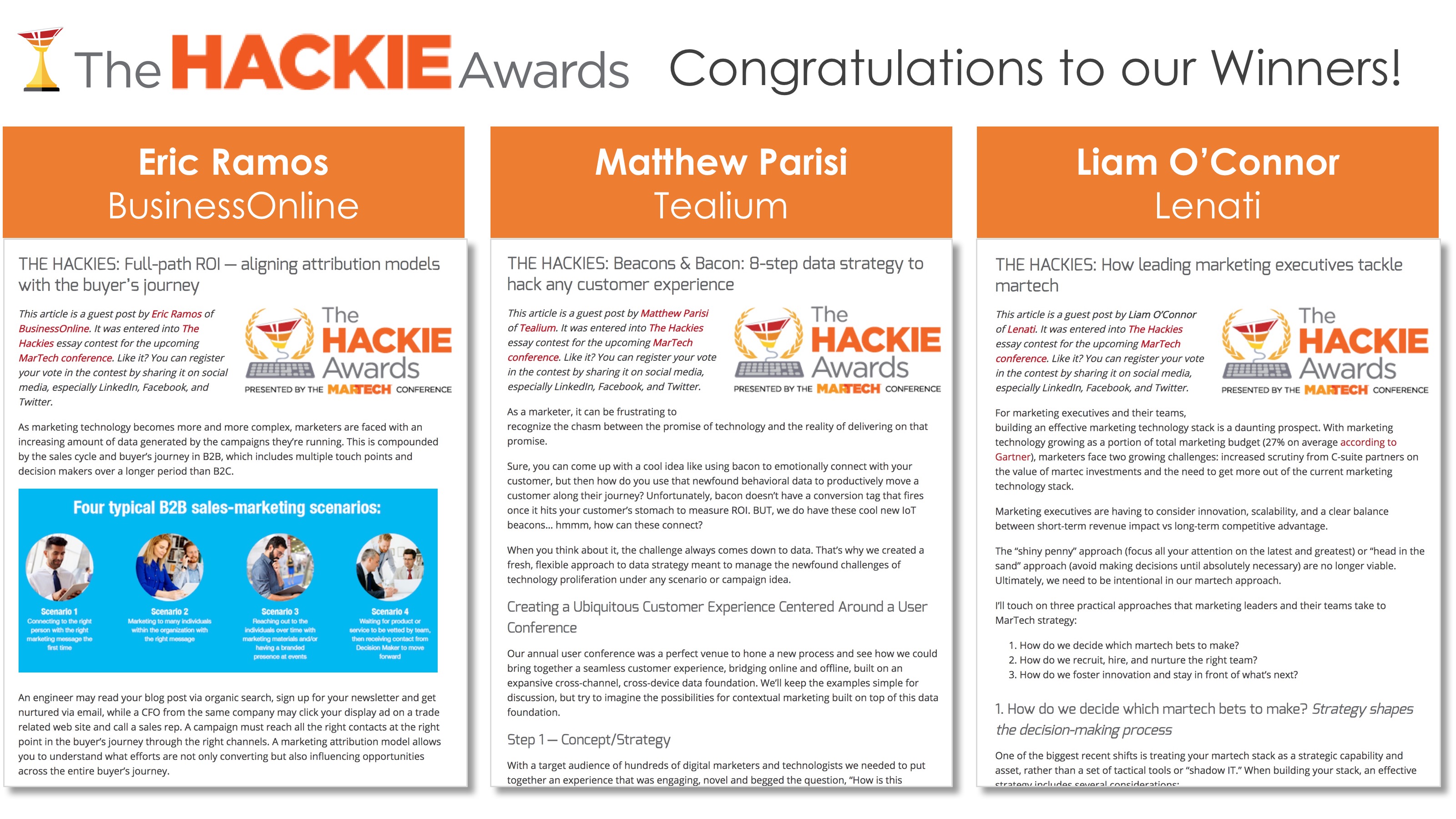 The three Hackies winners were chosen by the number of social media shares their articles received on chiefmartec.com, MarTech Today, and the MarTech Conference site: