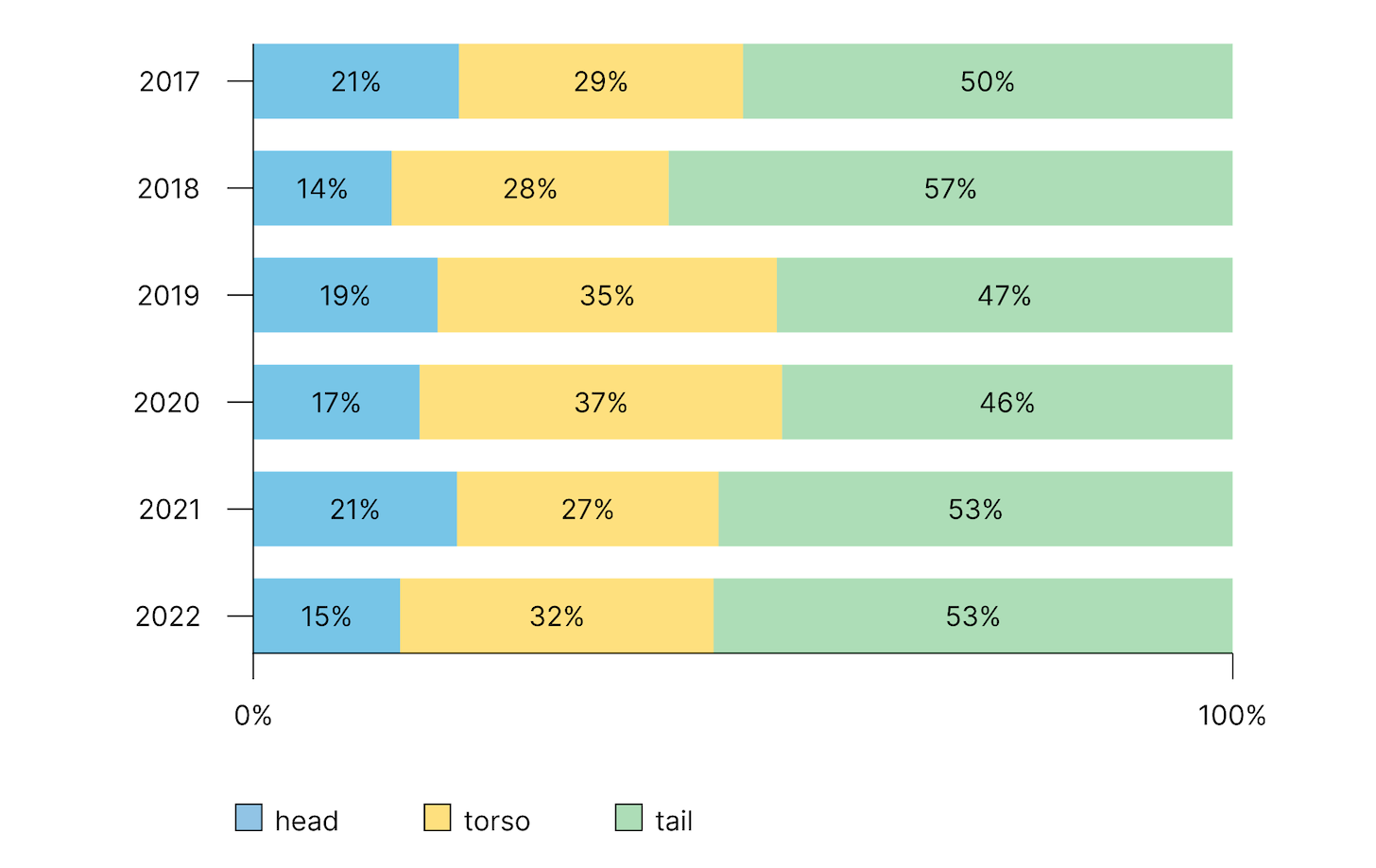 Despite the enormous forces of consolidation by major platforms in the head — Adobe, HubSpot, Microsoft, Oracle, Salesforce, etc. — we see a relatively constant balance with torso apps (large specialist apps, generally north of $100 million in revenue) and small apps in the tail (everything else).