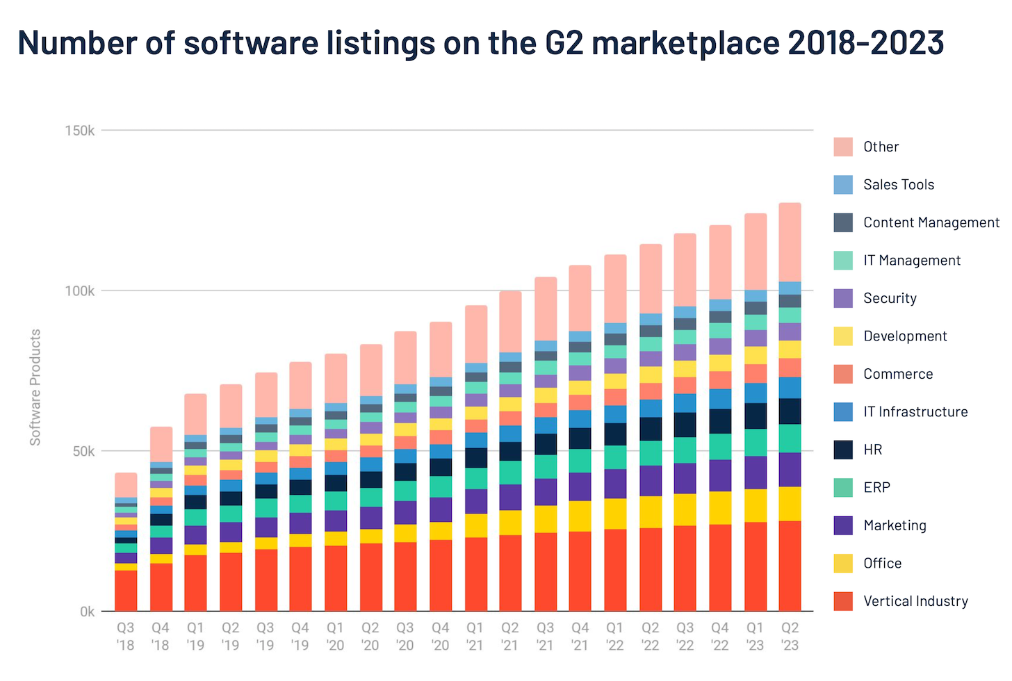 By the way, these dynamics aren’t unique to martech. The same pattern appears in other SaaS categories too — engineering, finance, HR, IT, security, sales, etc. The software reviews site G2 recently published their Q4 2023 State of Software where they reported having ~125,000 B2B software products listed on their marketplace: