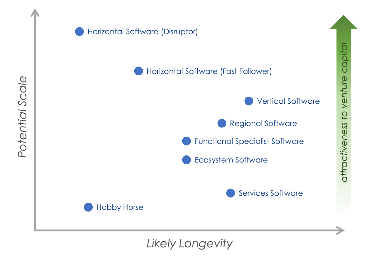 - Horizontal software (fast follower) startups — also early stage, chasing disruptors.