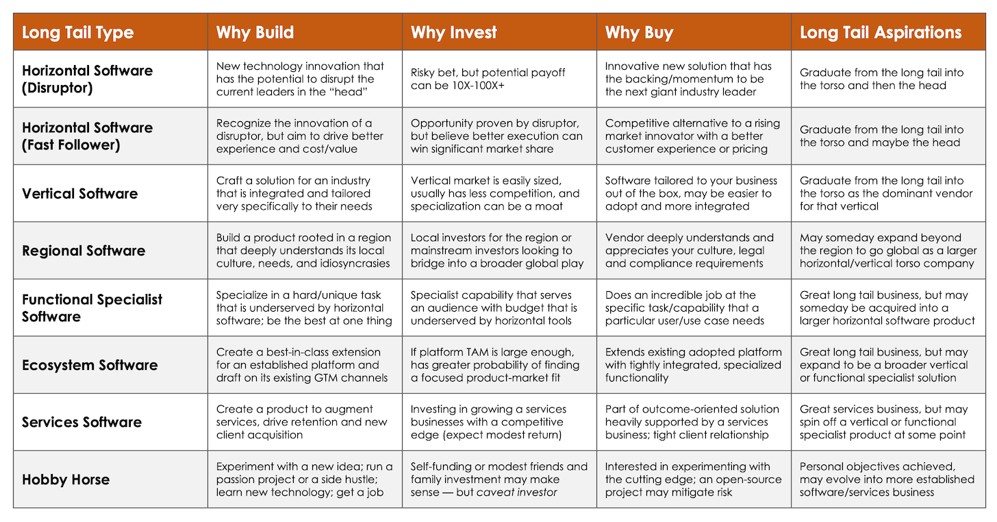 Being in the long tail is not a bad thing for these companies or their customers. They may not be multi-billion dollar businesses, but they can be very profitable multi-million dollar businesses that are the best in their space and loved by their customers. And a few of them will evolve, typically by acquiring or being acquired, into larger head/torso businesses over time.