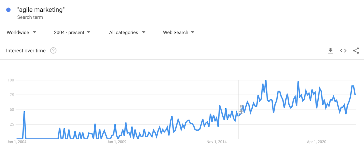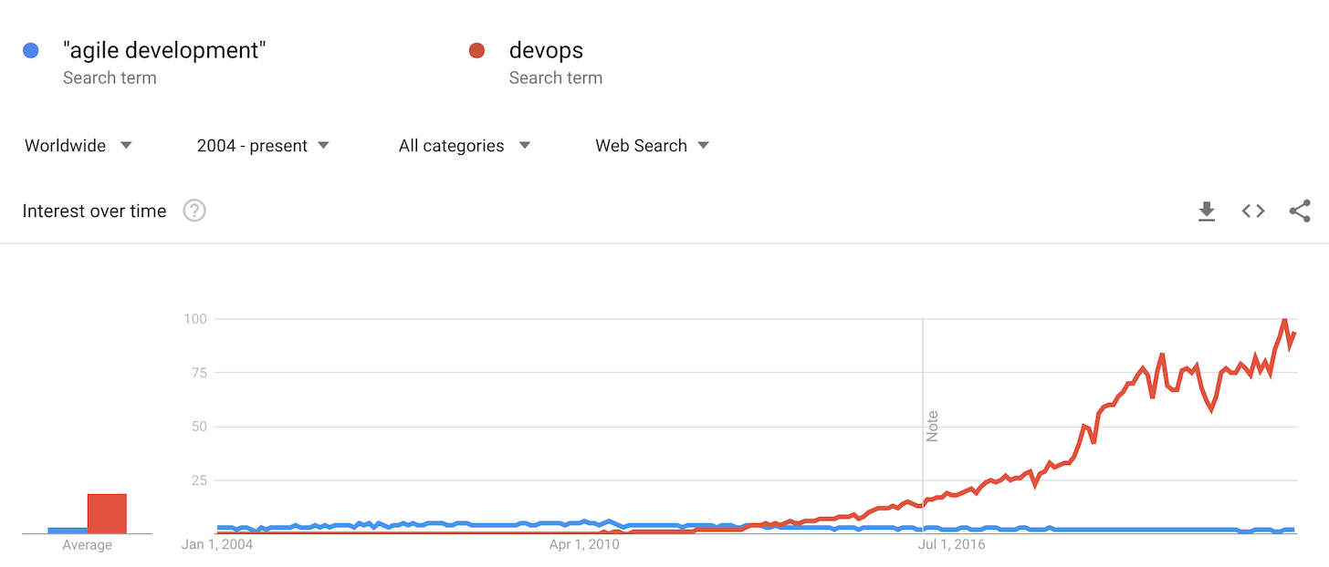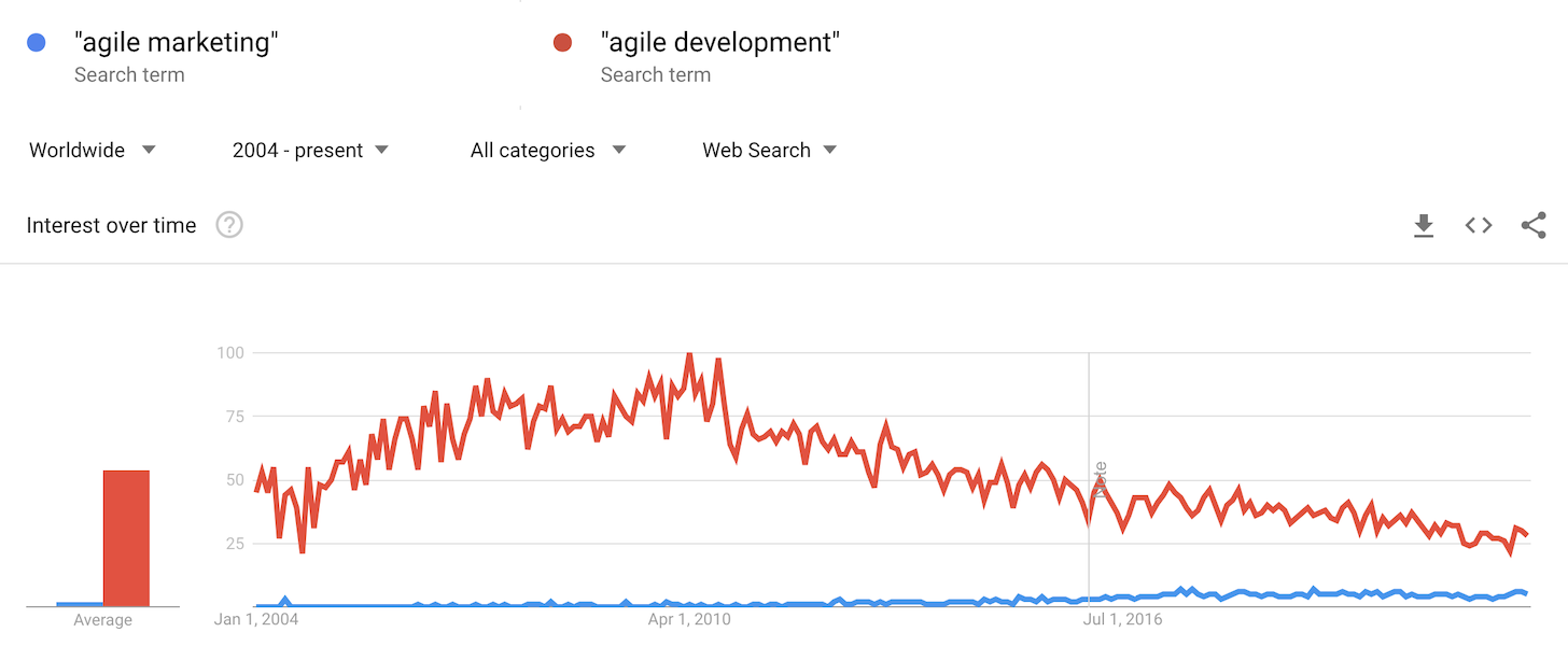 Indeed, DevOps became the giant that stood on the shoulders of agile development. Its popularity has dwarfed agile development, even from its heyday. And compared to those two, agile marketing would barely even register on the scale.