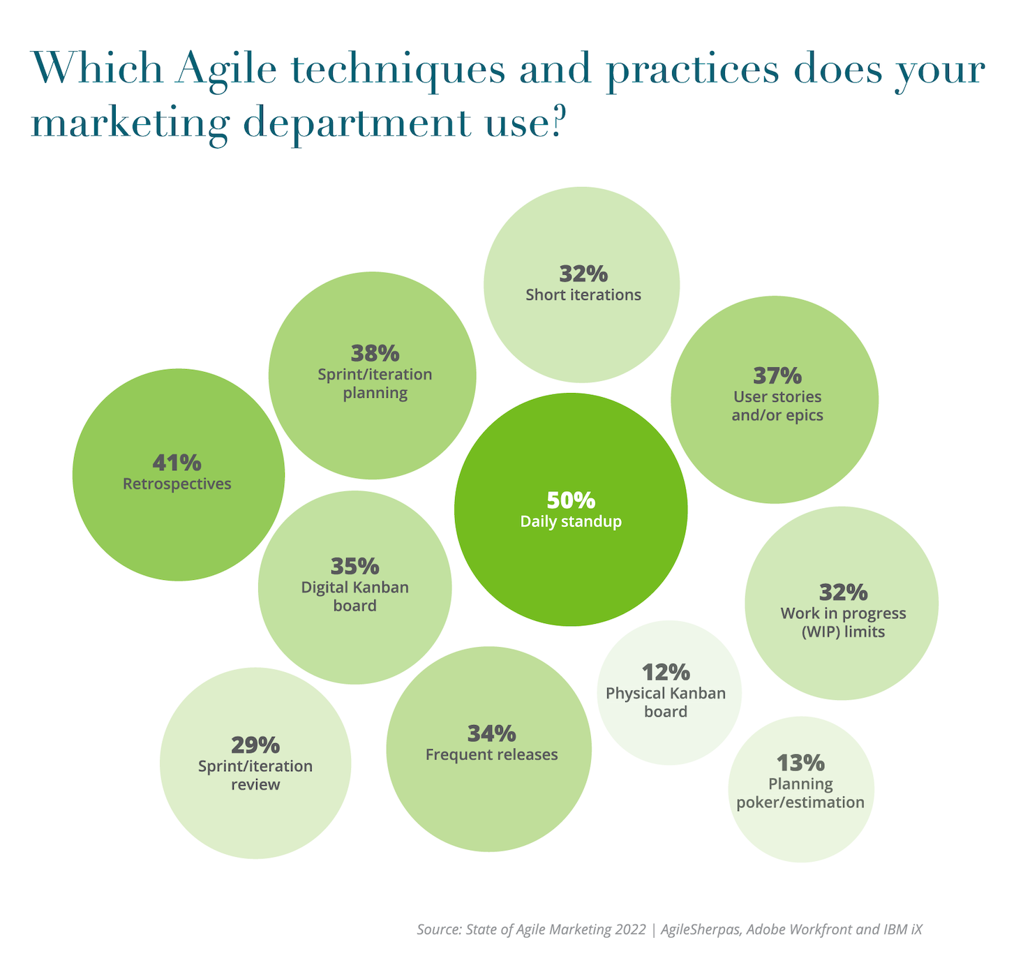 It’s even being applied (30%) in events marketing, which has long been the go-to example for skeptics: “Oh, agile could never work for events.” (To be fair, in a virtual/hybrid event world, the pacing and adaptability of events marketing has increased significantly.)