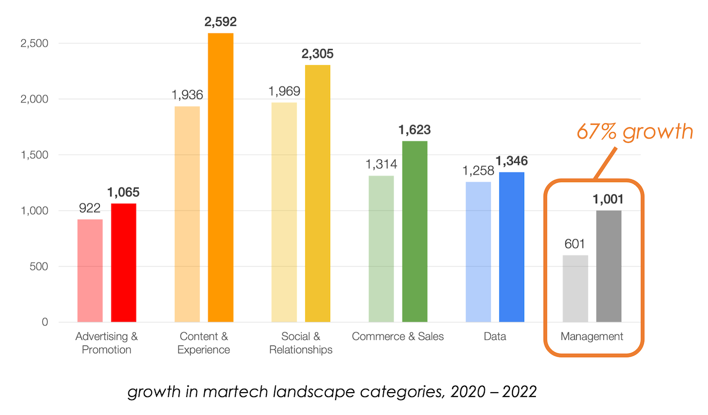 Indeed, the Management category of the martech landscape had the largest percentage growth from 2020 to 2022.