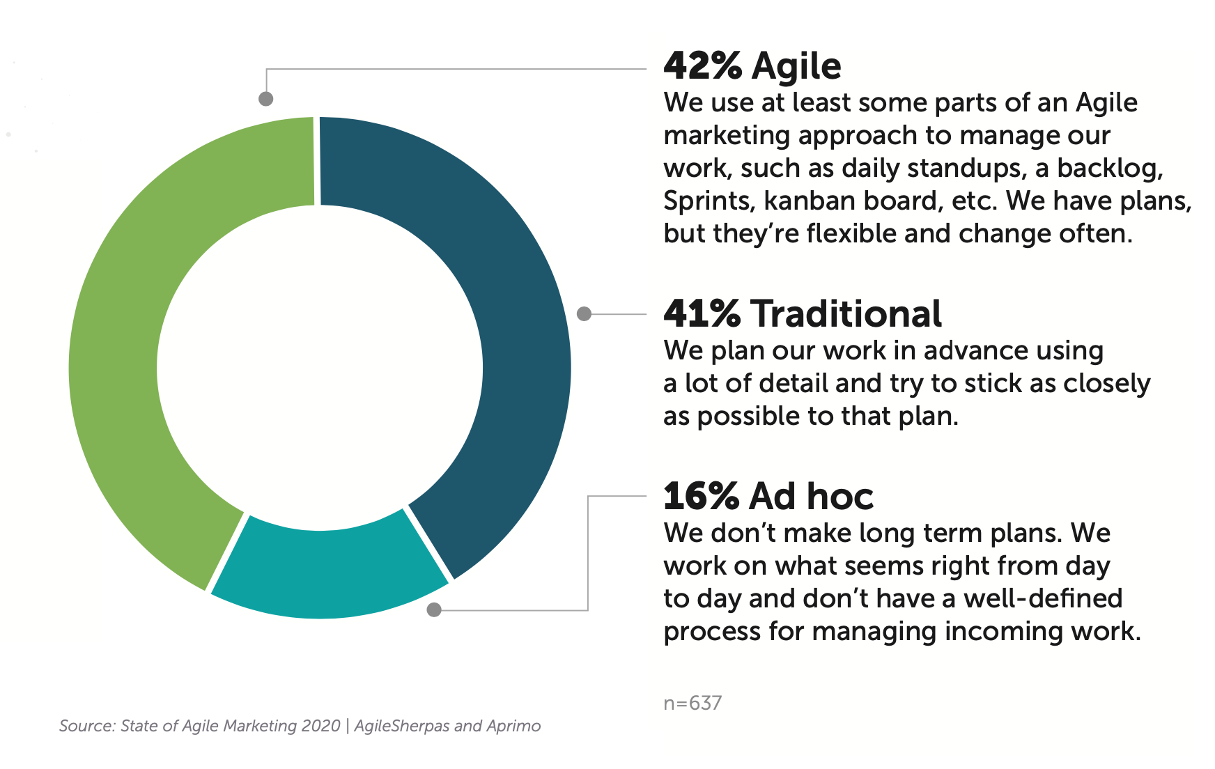 The big trend: agile marketing adoption is up from 32% in 2019 to 42% in 2020. Almost all of the growth in agile comes from a reduction in the percentage of marketers identifying with the “traditional” model of marketing management.