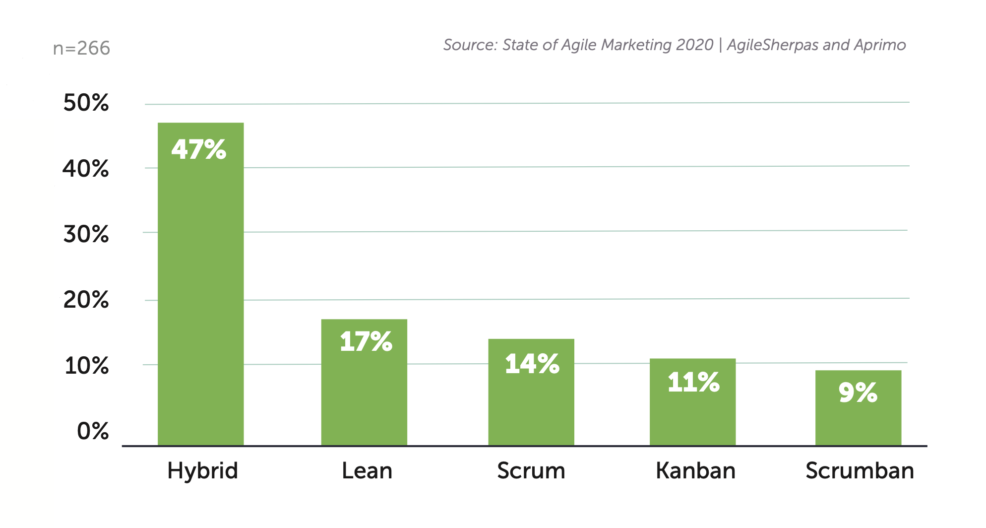 Of course, how marketing teams implement agile marketing has high variance. 47% report using a “hyrid” marketing methodology that they tailor to their specific culture and operational needs, drawing upon a variety of agile mechanisms from Scrum, Lean, Kanban, etc.