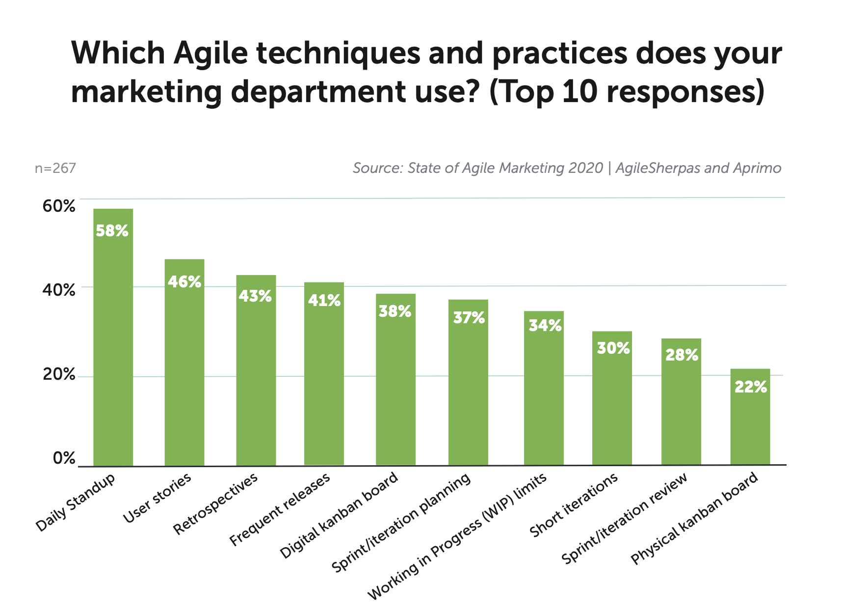 I am particularly heartened that 43% have embraced retrospectives as part of their agile operating system. Agile shouldn’t be just about iterating and learning around the outputs of marketing — what’s working, what’s not in the market. It should be about iterating and learning how to work more effectively as a team, adapting the process itself.