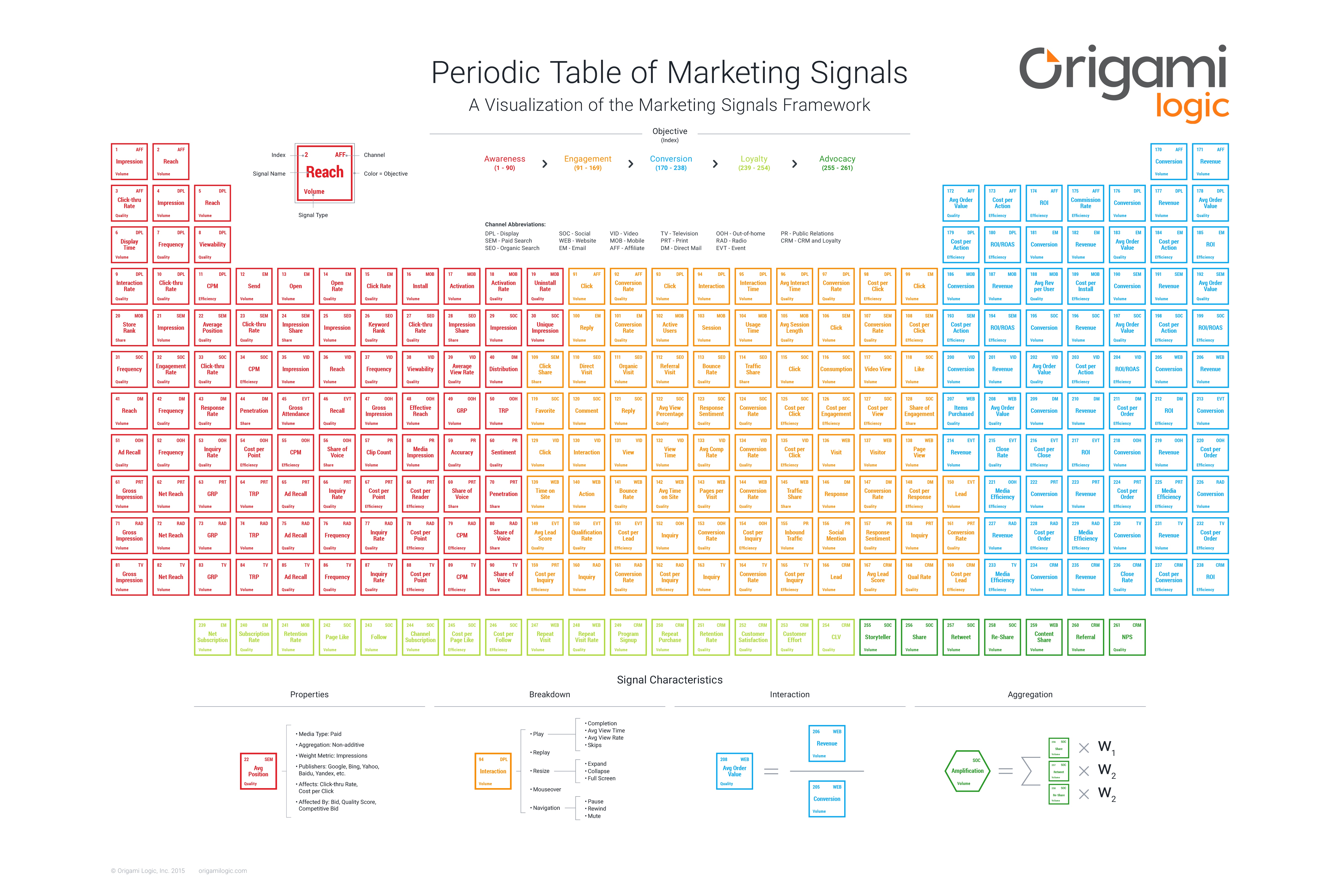 The Periodic Table of Marketing Signals is a visual representation of the Marketing Signals Framework and organizes signals across marketing channels according to three specific dimensions: