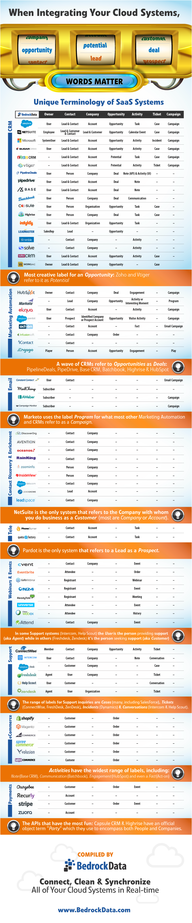 Tying back to the infographic, the line across the top is the Bedrock Data term that we use as a standard. So when we are working with customer and connecting multiple systems, data is getting normalized across all of the connected systems using a common Bedrock term.