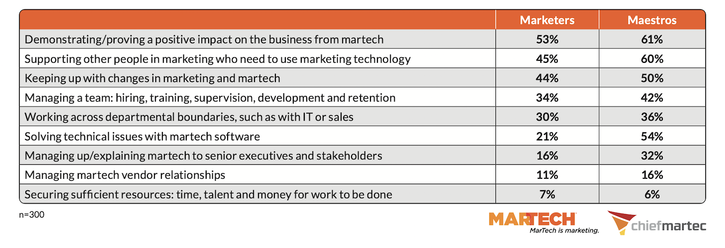 Yes, half of them (50%) enjoy keeping up with changes in marketing and martech. If you don’t love change, this probably isn’t the career for you. And successfully solving technical issues with martech software is a source of satisfaction and pride (54%).