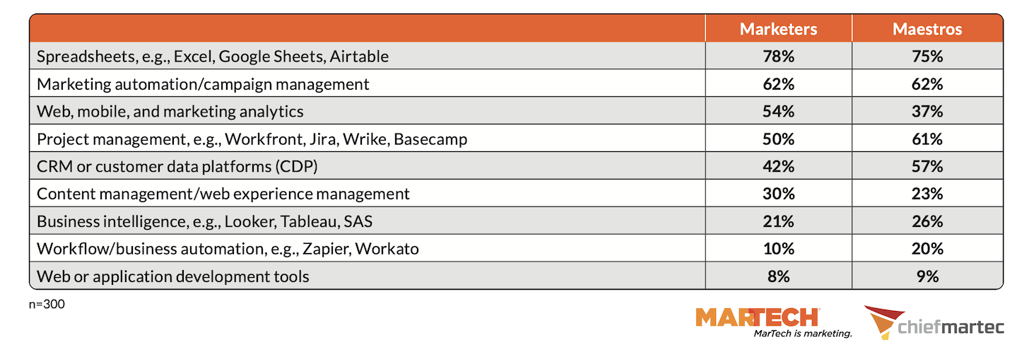 Well, ha, spreadsheets continue to be the most common “martech” tool that both marketing ops maestros and general marketers spend 10 or more hours a week working in. The next three most common categories of tools frequently used in marketing ops are: