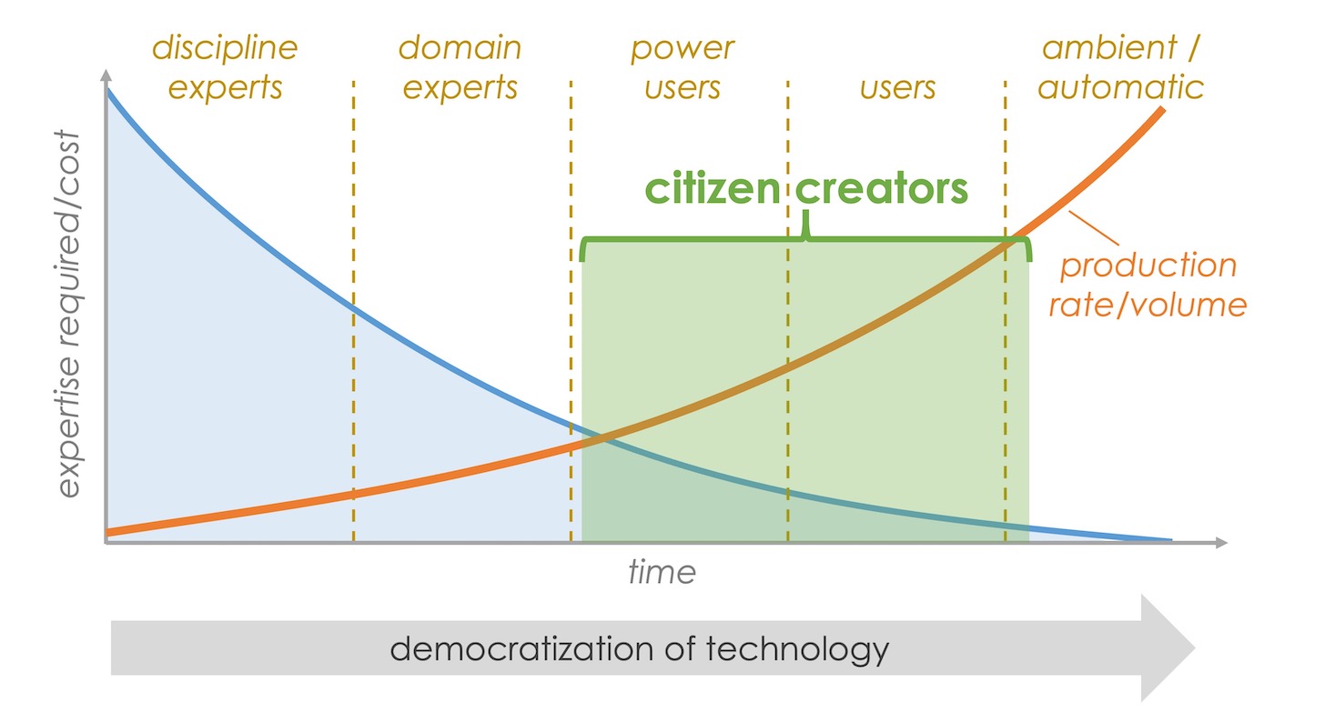 Nearly every technology innovation follows this pattern. We’re seeing it today with no-code tools imbuing non-technical marketers with technical superpowers. For entrepreneurs and practitioners in a domain, such as marketing, great opportunities are consistently found at the points where a technology crosses a boundary from a smaller specialist group of users to a larger, more generalist one. And you can see them coming from a mile away.